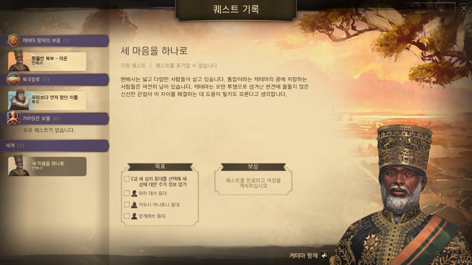 중재자 업적을 시작하려면 퀘테마 황제에게 세 마음을 하나로 라는 퀘스트를 받아야 합니다.