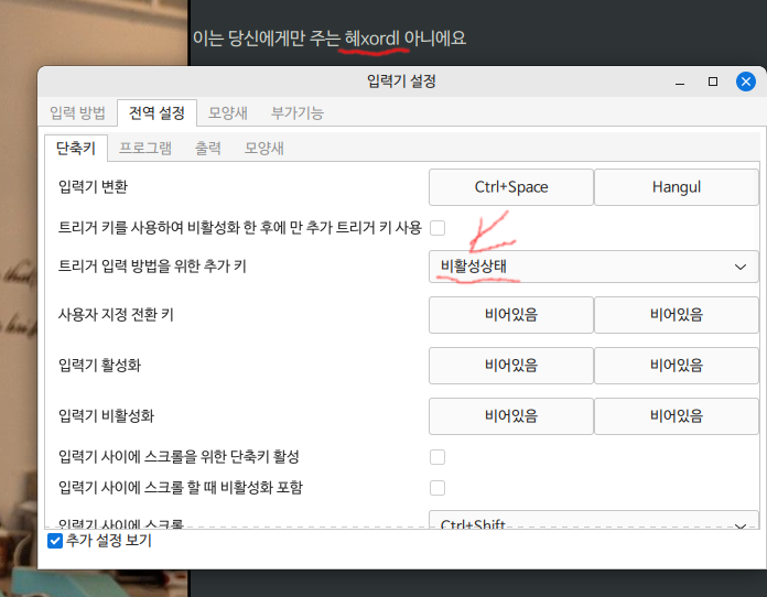 하단바 Fcitx 에서 마우스 오른쪽 버튼 / 설정을 누른 후 전역 설정 선택/ 추가 설정 보기 선택 / 트리거 입력 방법을 위한 추가 키 비활성 상태.