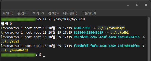 (sudo fdisk -l 혹은 ls -l /dev/disk/by-uuid 명령어로 확인한 후 지정)