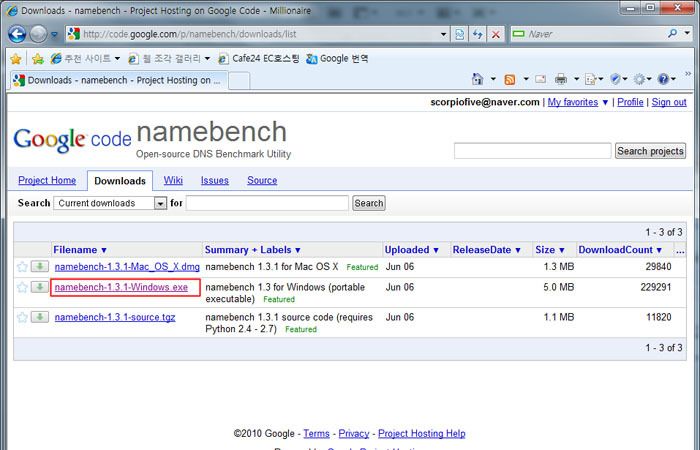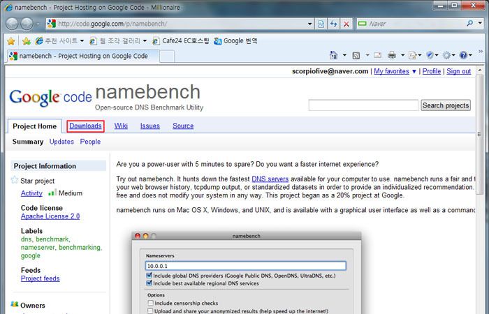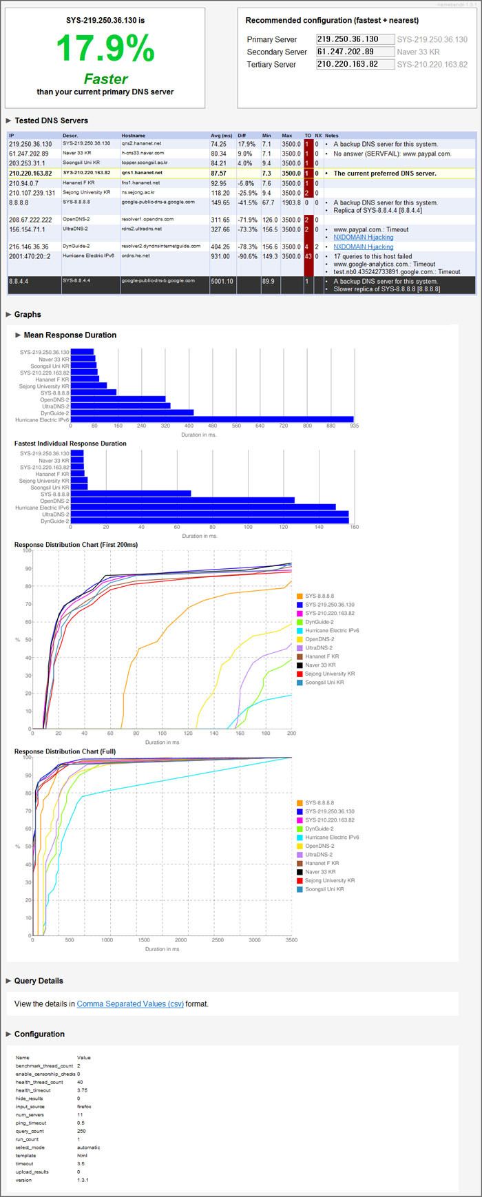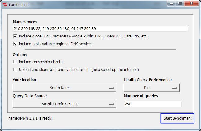 구글에서 만든 네임벤치라는 프로그램을 다운로드 받으신 후 프로그램을 실행 하시면 다음과 같은 화면이 나옵니다.