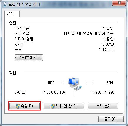 네트워크 설정에서 로컬 영역 연결을 선택하시면 다음과 같은 화면이 나옵니다.