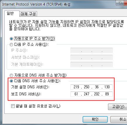 위의 화면과 같이 기본 설정과 보조 설정을 namebench의 내용대로 넣어주시고 확인을 하시면 몇배 이상의 체감 속도를 느끼 실 수 있습니다.