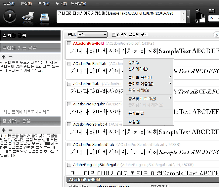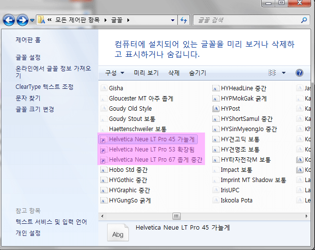 보시는 바와 같이 글꼴 관리가 편리하게되어 있으며 윈도우 7에서도 잘 동작 되는군요