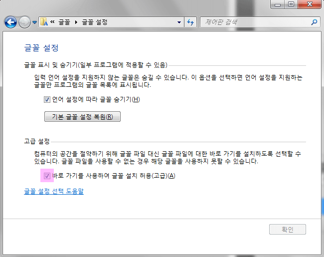 글꼴 설정을 클릭하셨다면 설정 화면으로 들어오게 되는데 이때 고급 설정에 '바로 가기를 사용하여 글꼴 설치 허용(고급)(A)' 를 클릭하신 후 확인을 누르세요