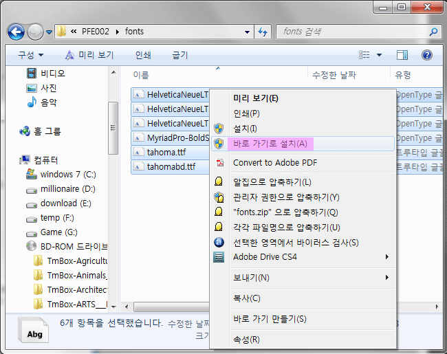 설치하시고자 하는 글꼴을 선택하신 후 마우스 오른쪽 버튼을 누르시면 '바로 가기로 설치(A)'가 나오는데 이 부분을 선택하여 클릭하세요
